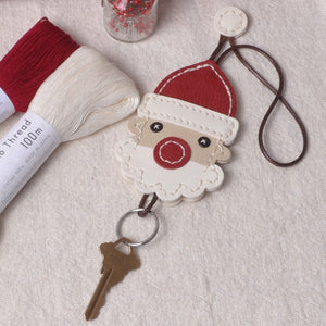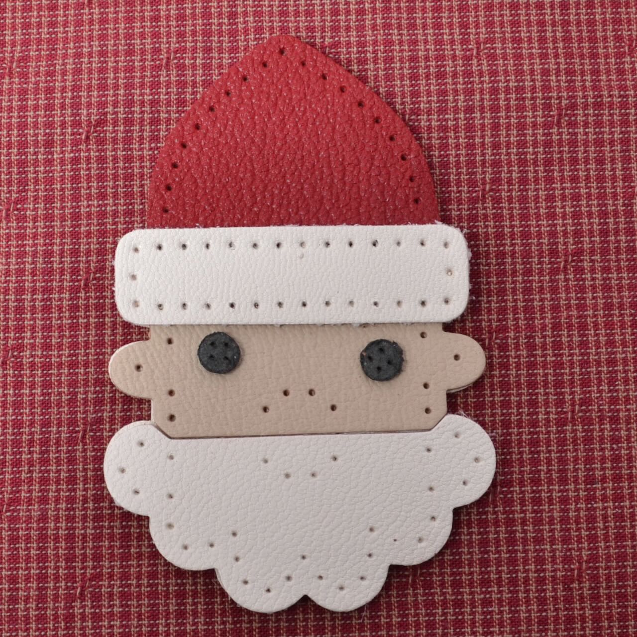 This is a fun Christmas project you can make in an hour or two. When stitched together the pre cut leather pieces become a cute hanging Santa with a space between the from and back just wide enough to hide your keys.  Pull the cord at the top of the hat up and the keys disappear inside. Pull the keys down and the white circles become the top of the Santa hat.