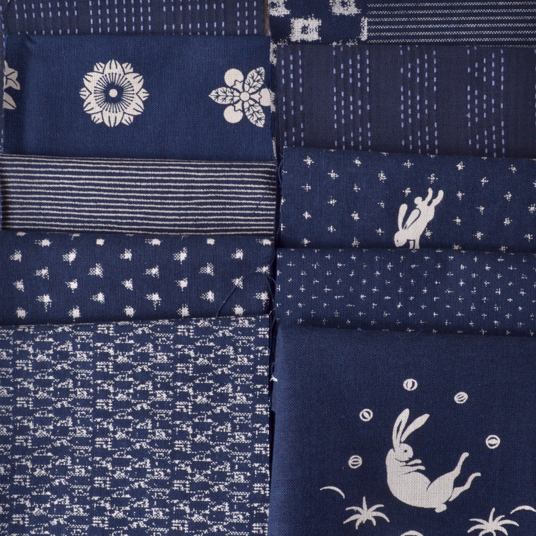 This is a collection of 8 Japanese Olympus cotton fabrics (each 5" X 22"), plus two 6 inch square bunny patches, for those of you looking for a mix of traditional assorted Japanese fabrics designs for your boro, visible mending, piecing or applique projects.