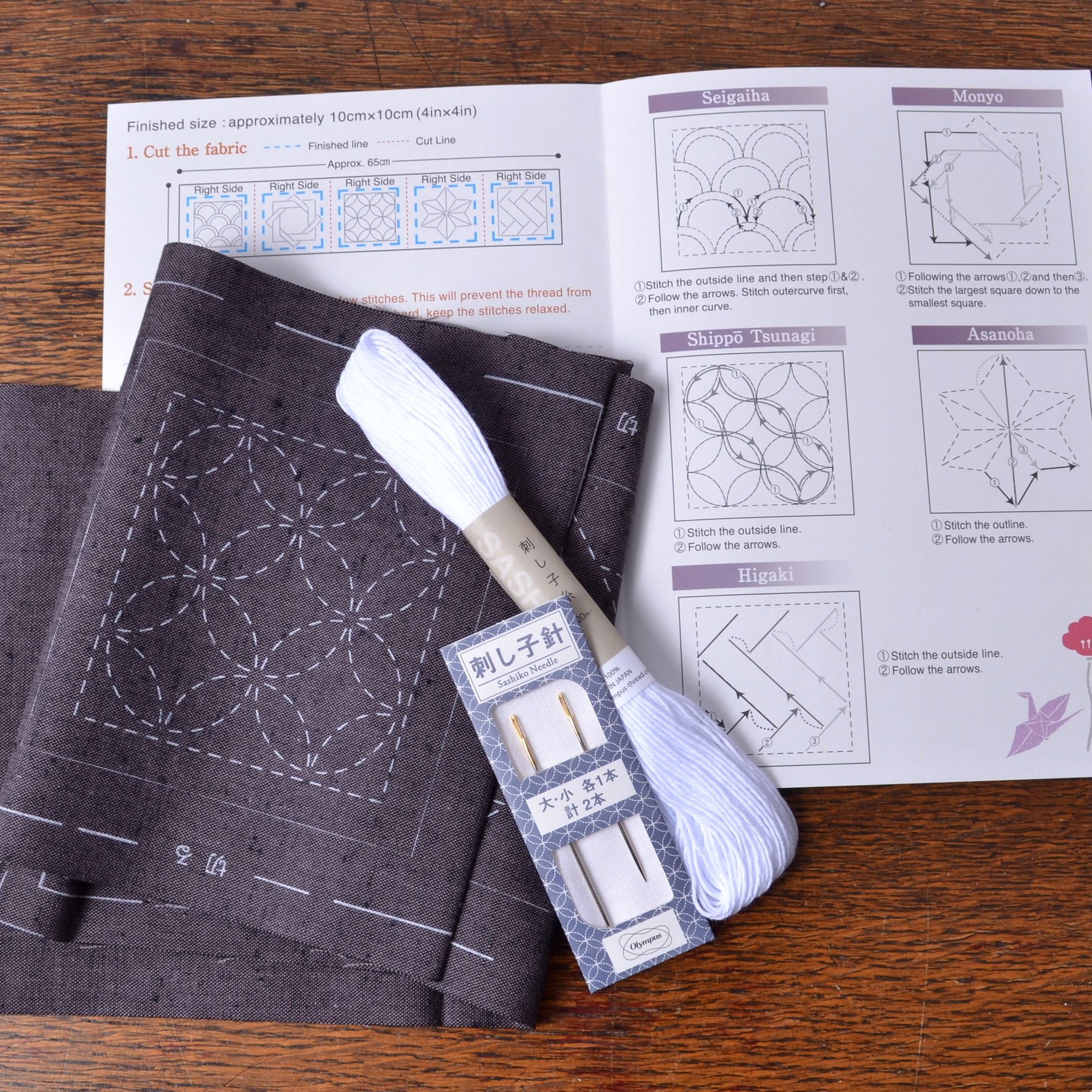 These five traditional sashiko patterns are printed on Japanese Tsumugi cotton fabric with wash out ink. They are ready to stitch as soon as you open the package, and when your stitching in finished a short soak and rinse in warm water will wash the printed completely away.