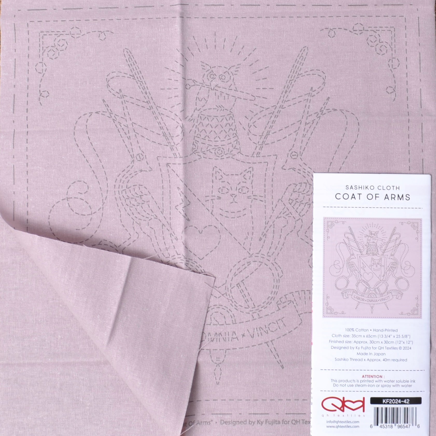 This ready to stitch "Sashiko Coat of Arms" is printed on a pale taupe rose cotton/linen blend cloth.