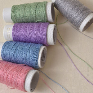 Hidamari Sashiko thread, 100% cotton, on 30 meter spools. If you would like a thinner sashiko stitching thread for a lighter looking stitched line, this is a good choice. It is a firmer thread, so it doesn't have the slight fuzz of the softer 20 meter Olympus sashiko thread skeins, and it it truly a matter of preference whether this is a better feature :-)