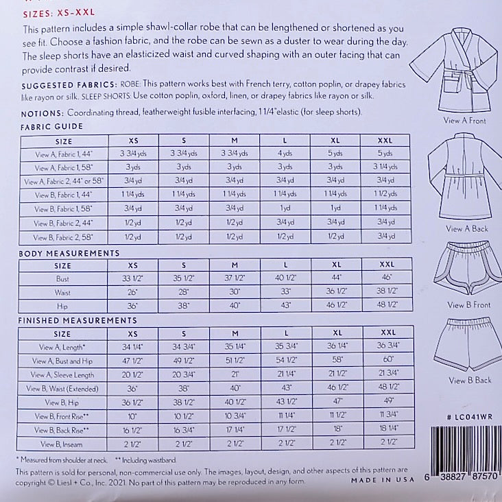 Wynwood Robe + Sleep Shorts, women's sizes xxs-xxl pattern by Liesl & Co.