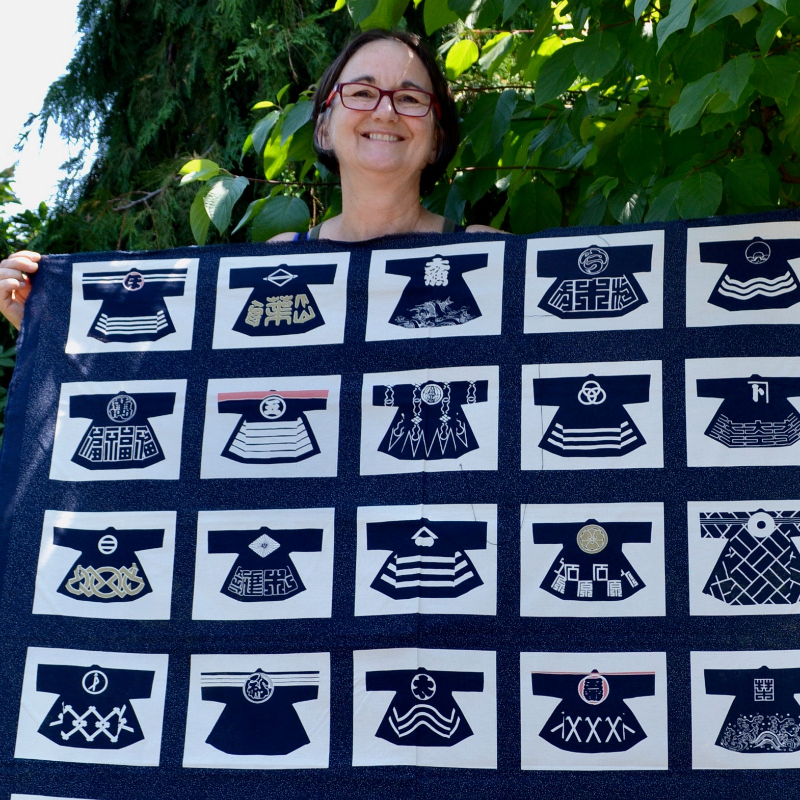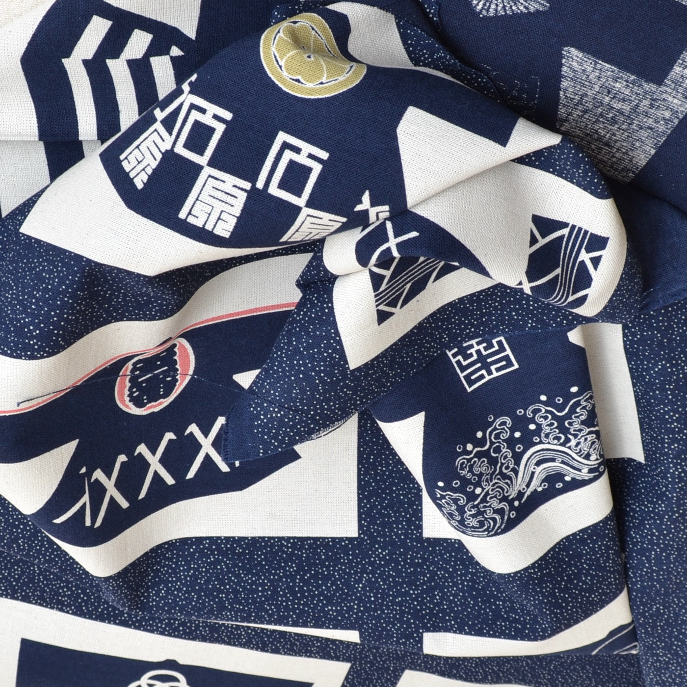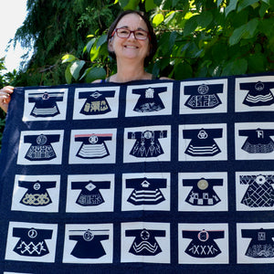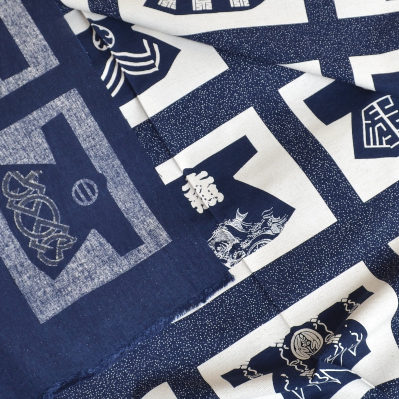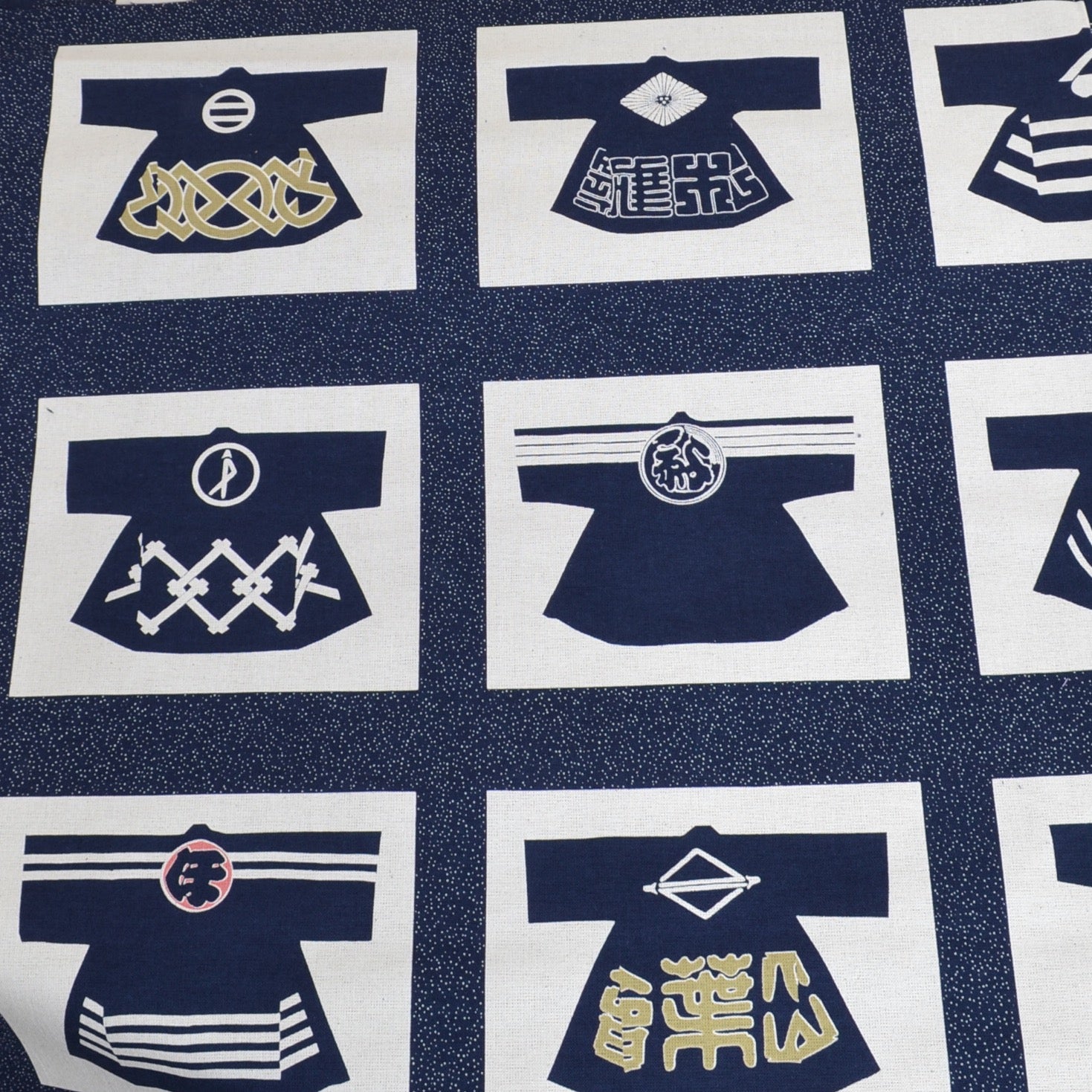 Olympus Takumi Series. This artisan fabric panel printed with 20 different Firemen coat designs. Manufactured by Olympus Manufacturing in Japan, this high quality cotton fabric is both colourfast and machine washable. Olympus has taken care that it's colour and texture resemble early artisan wagara fabrics.