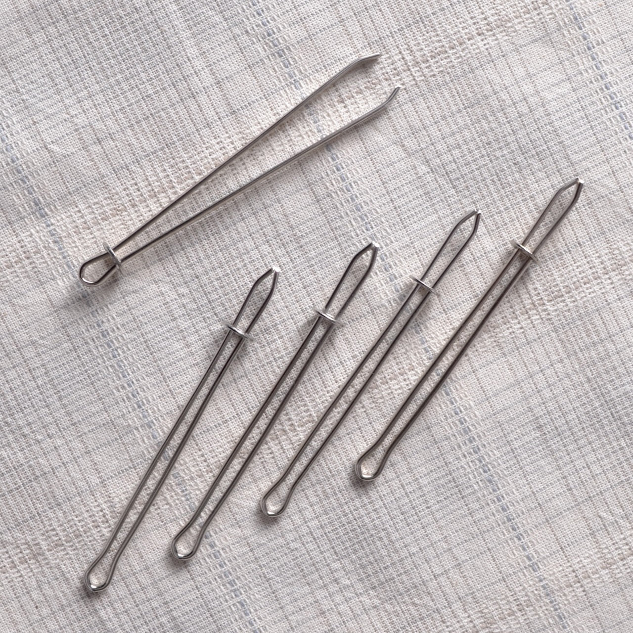 3" metal tweezer style bodkin for replacing elastics, ribbon or drawstrings.