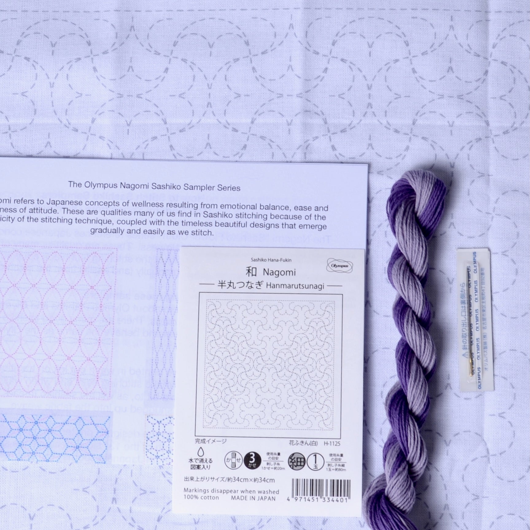 - Kit includes white cotton fabric with Hanmarutsunagi pattern printed in wash out ink, 2 colours of purple sashiko thread, sashiko needle