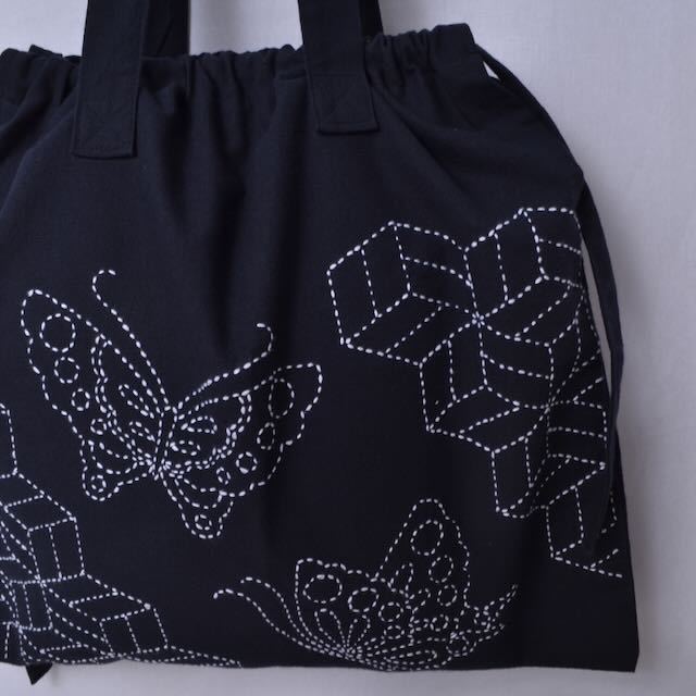 One of the Olympus sashiko kits that are not readily available anymore, this ready to stitch kit contains a partially sewn dark blue cotton bag printed with the butterflies and tumbling block pattern in the photo. The fabric is a good quality strong cotton and all the edges are serged so they will not ravel. All the seams are sewn except the two side seams which have been left open to make your sashiko stitching more enjoyable. You can hand or machine stitch them closed when your sashiko stitching is finished and then soak and rinse the finished bag to wash away the printed markings.