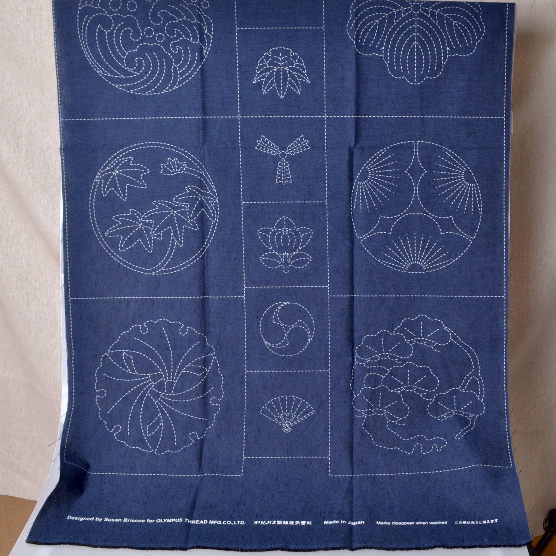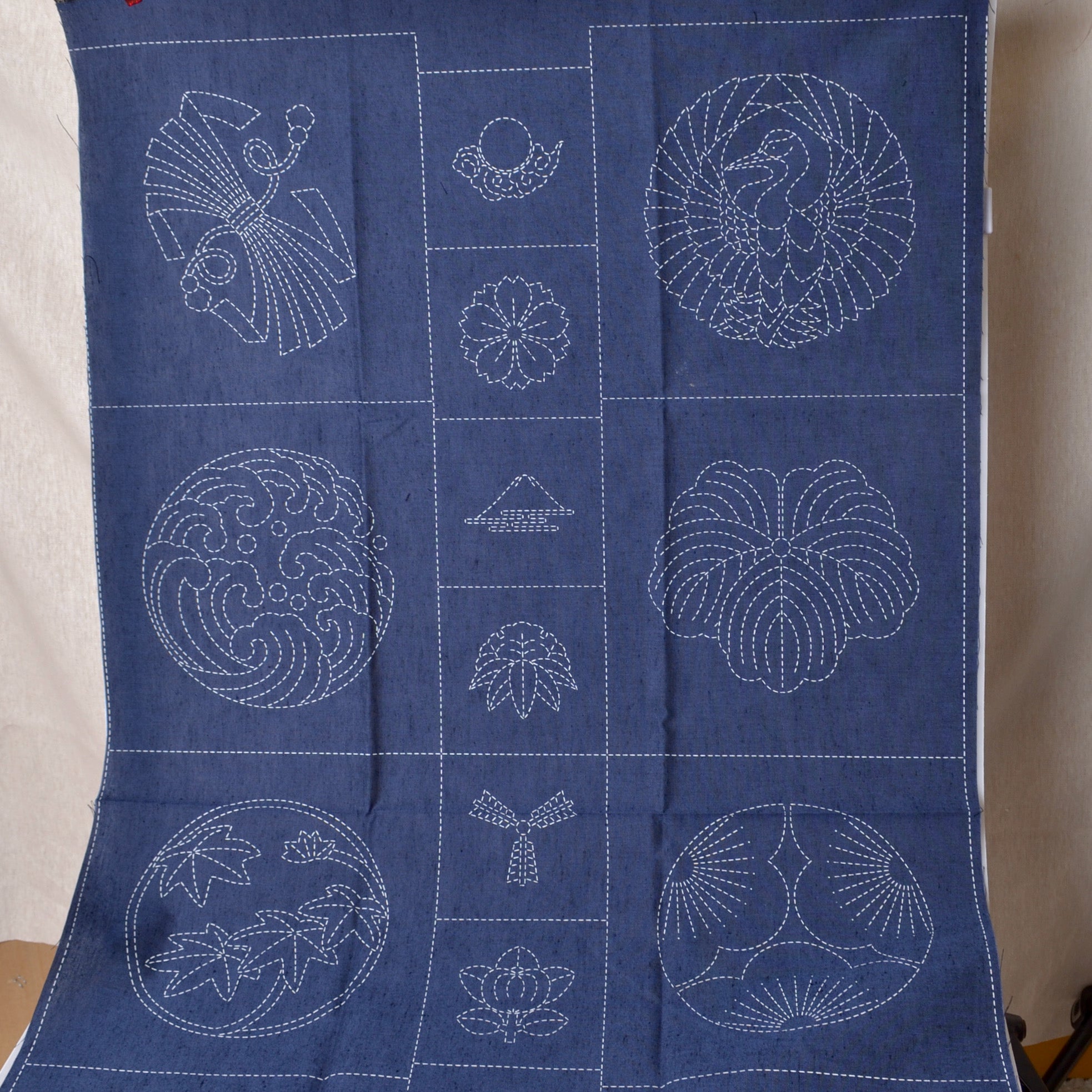 This dark indigo colour tsumugi cotton fabric Sashiko Family Crest panel has eight different family crest designs (each is 16" X 16" square) preprinted in wash out markings on tsumugi cotton fabric. With the design already on the fabric, you can thread your sashiko needle with some sashiko thread and enjoy the stitching. In addition there are eight 4 1/2" small motifs.