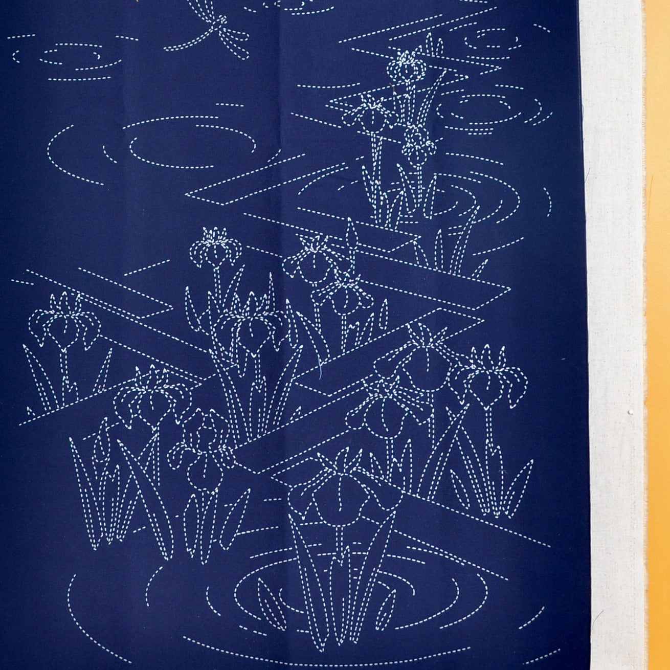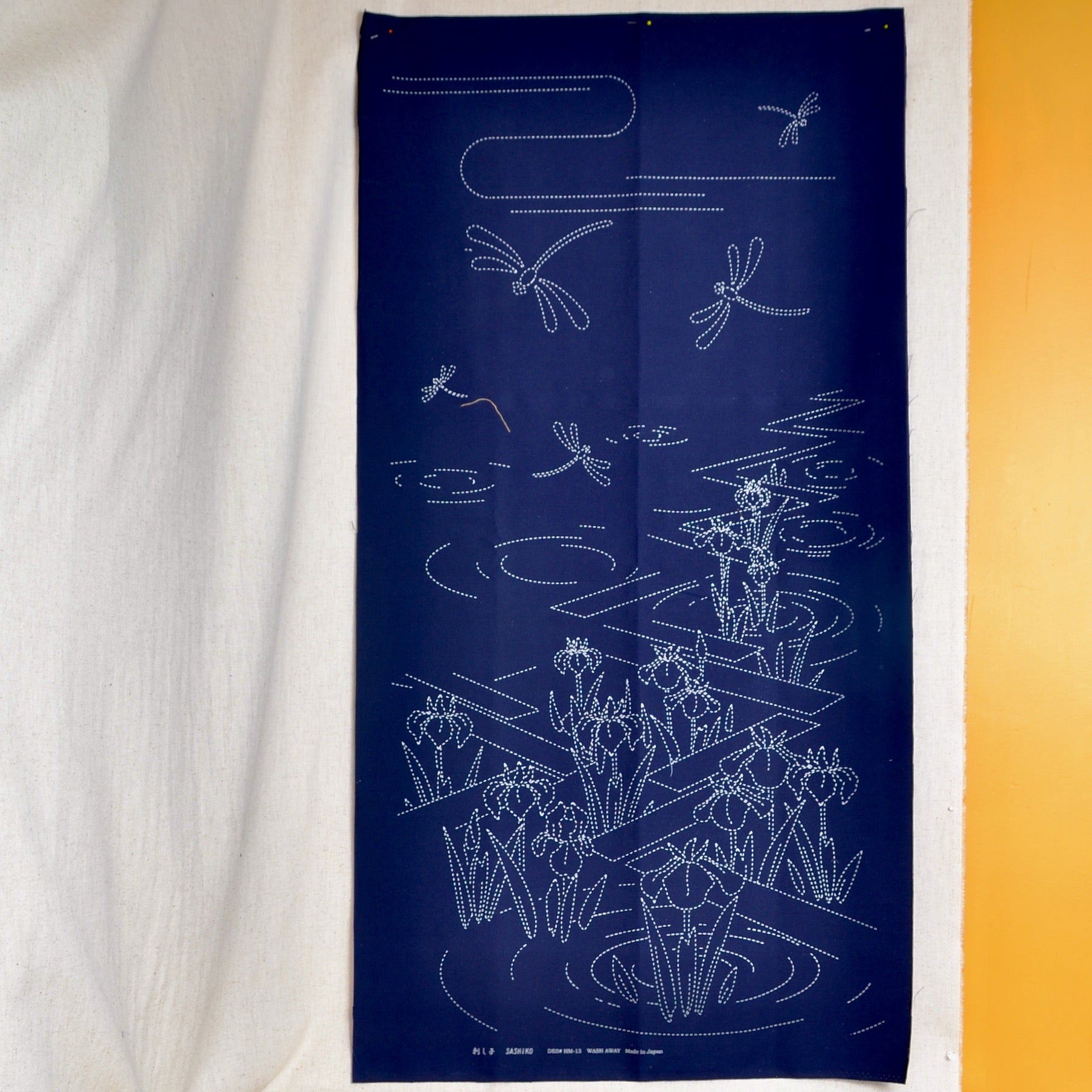Dragonflies circle above an Iris garden and it feels like a peaceful summer day in this Sashiko panel. It is printed on royal blue cotton fabric with wash out ink so you can thread your Sashiko needle with Sashiko thread and start stitching.