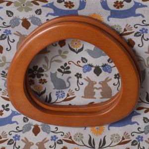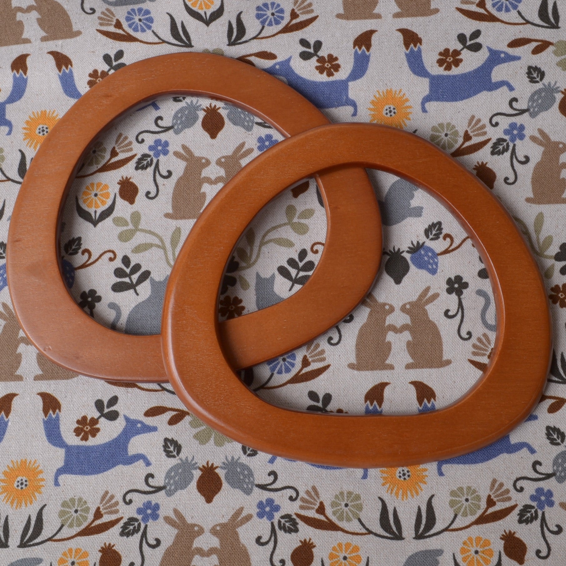 This pair of medium brown bag wood handles have a smooth finish. The front sides are slightly more rounded than the back.