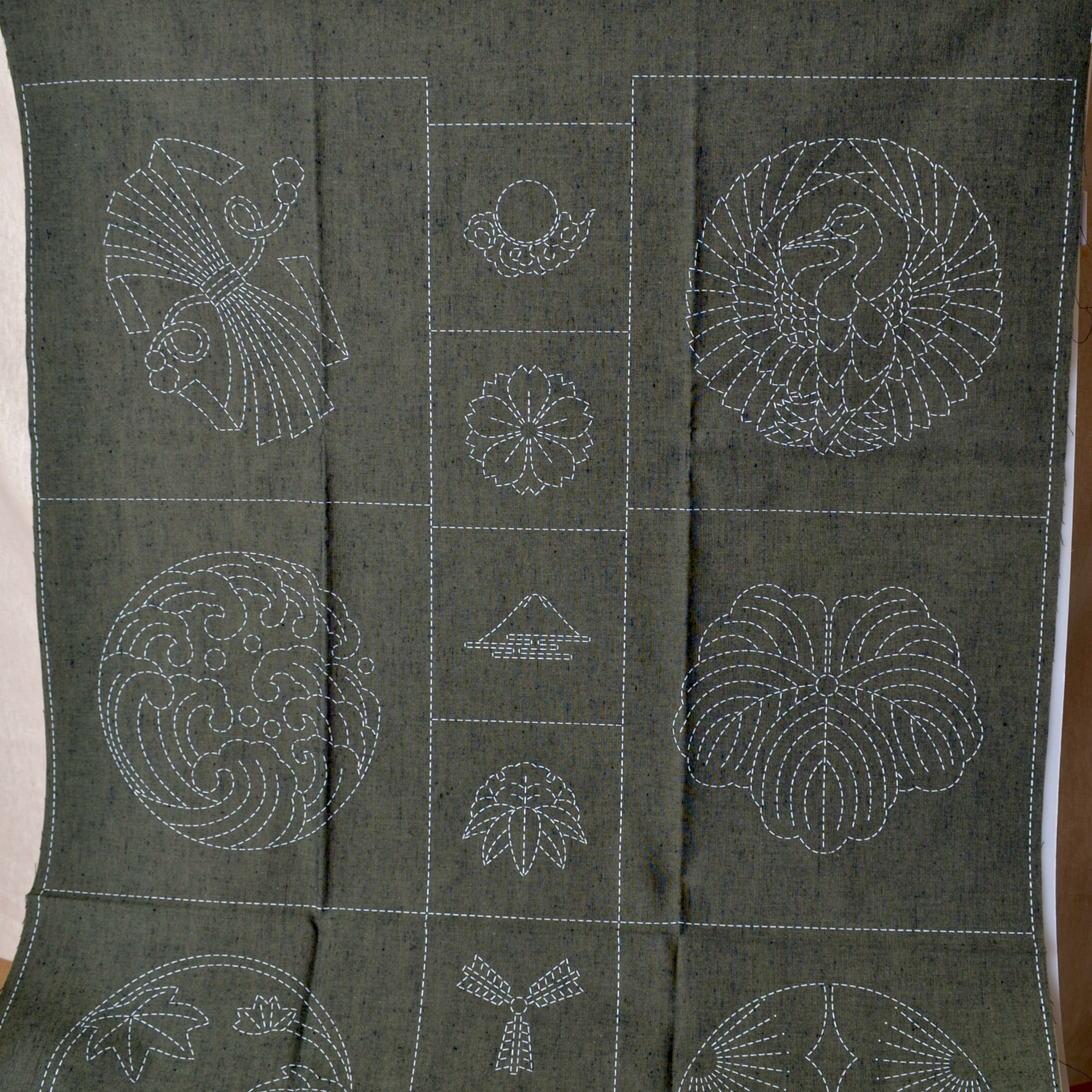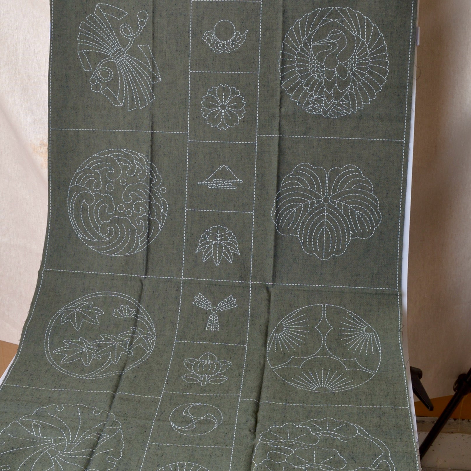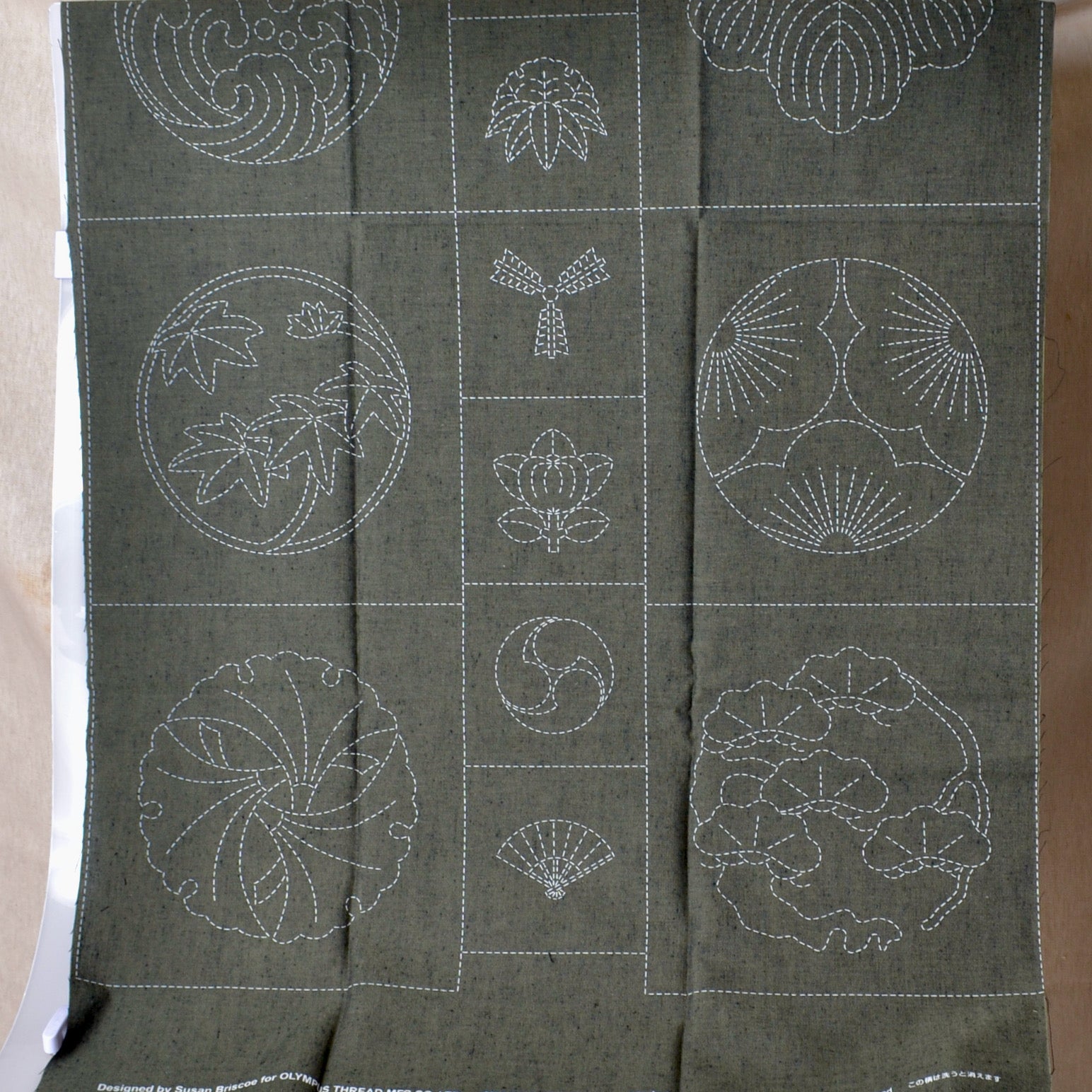 Earthy dark green Family Crest Sashiko Panel designed by Susan Briscoe. It has eight different family crest designs (each is 16" X 16" square) preprinted with wash out markings on tsumugi cotton fabric. With the design already on the fabric, you can thread your sashiko needle with some sashiko thread and enjoy the stitching. In addition there are eight 4 1/2" small motifs.