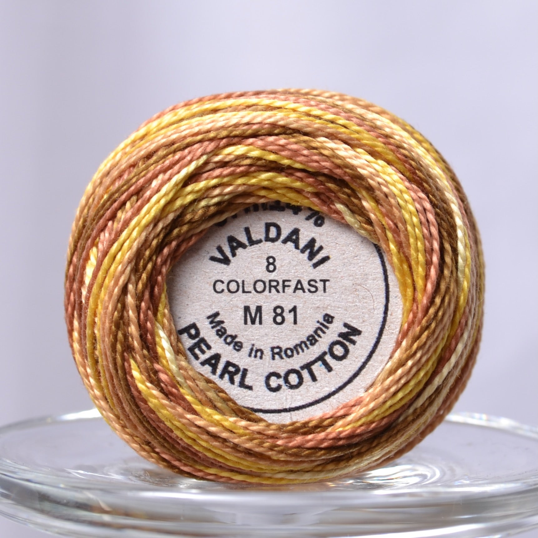 Valdani threads may have a bit of variation between dye lots because they are hand dyed.  Valdani threads are less tightly wrapped into balls than other perle cottons. This can make them a bit messier but is worth it because it protects the cotton fibres from being stretched and crushed.