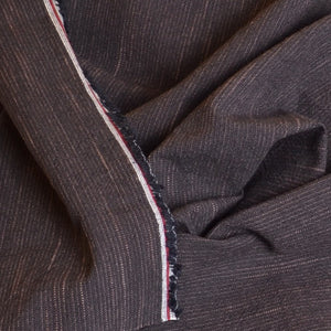 This dyed yarn cotton fabric is a medium weight sturdy dyed yarn cotton. It is very dark brown varied with an irregular tan thread. The fabric has a slightly rough (homespun feel) and will be easy to hand stitch.