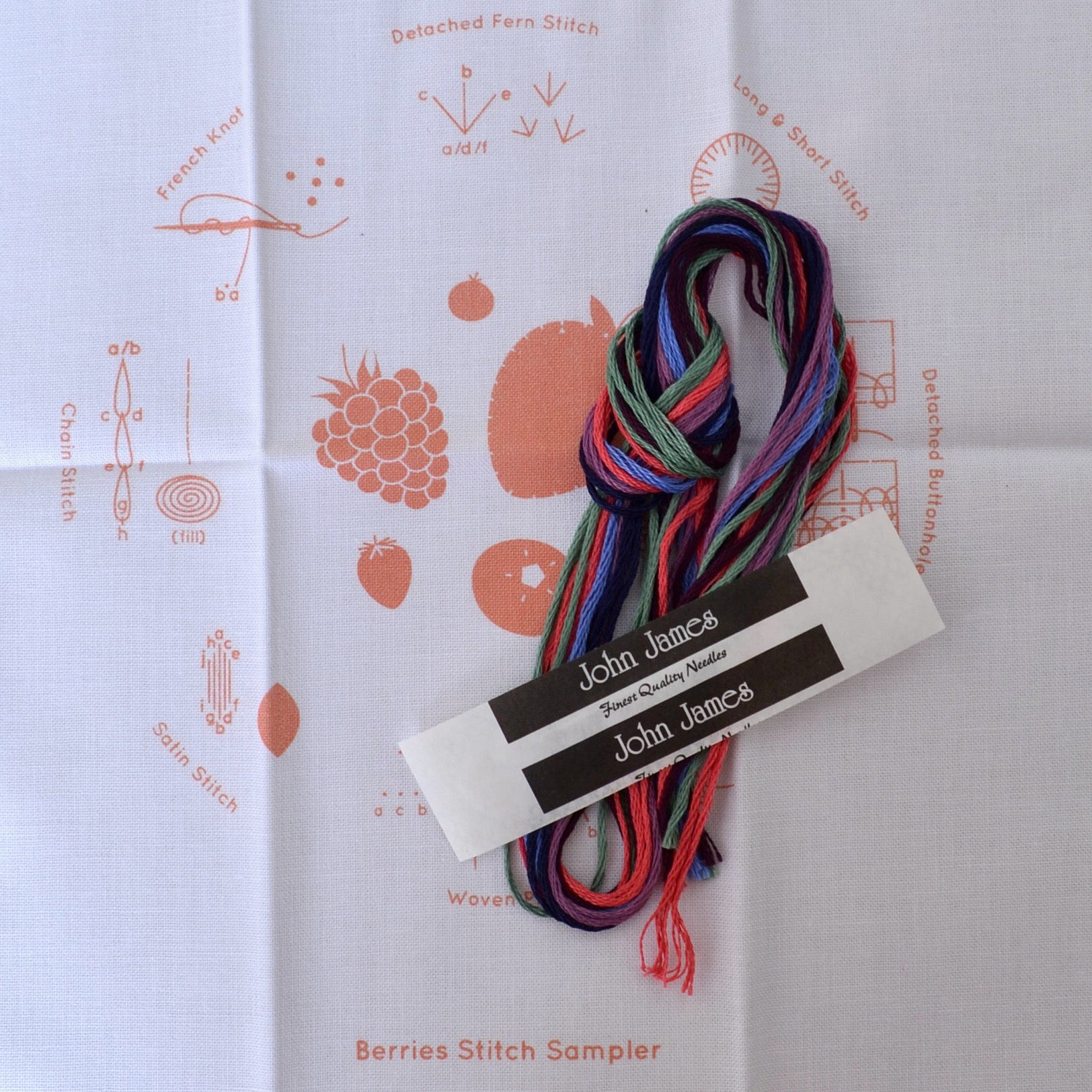 This kit contains an 8" x 8" screen printed sampler, DMC embroidery floss, #9 embroidery needle, and stitch instructions and a link to a downloadable stitch guide. (You will also need scissors and an embroidery hoop)