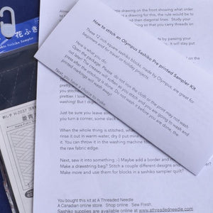 The sashiko printed design is 12" x 12" but the fabric provided is 13" x 26". For a nicer and more traditional sashiko piece, fold the unprinted fabric to the back of the printed fabric and do the stitching through both layers. (This also keeps the thread on the back showing through the fabric on white fabric pieces)
