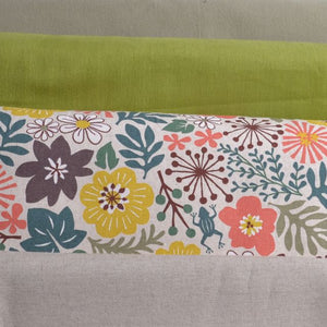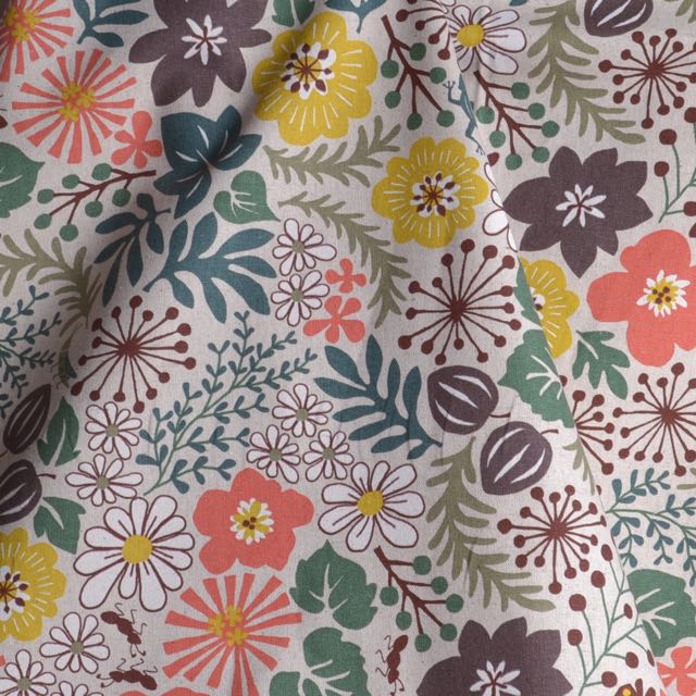 Stylised flowers on an oatmeal colour background. The background colour of this fabric looks like linen, but it is 100% cotton in a nice home decor/bag making weight. Look at the design for a minute and you'll find a frog, snail, butterflies and possibly a few ants and a cricket among the plant life.